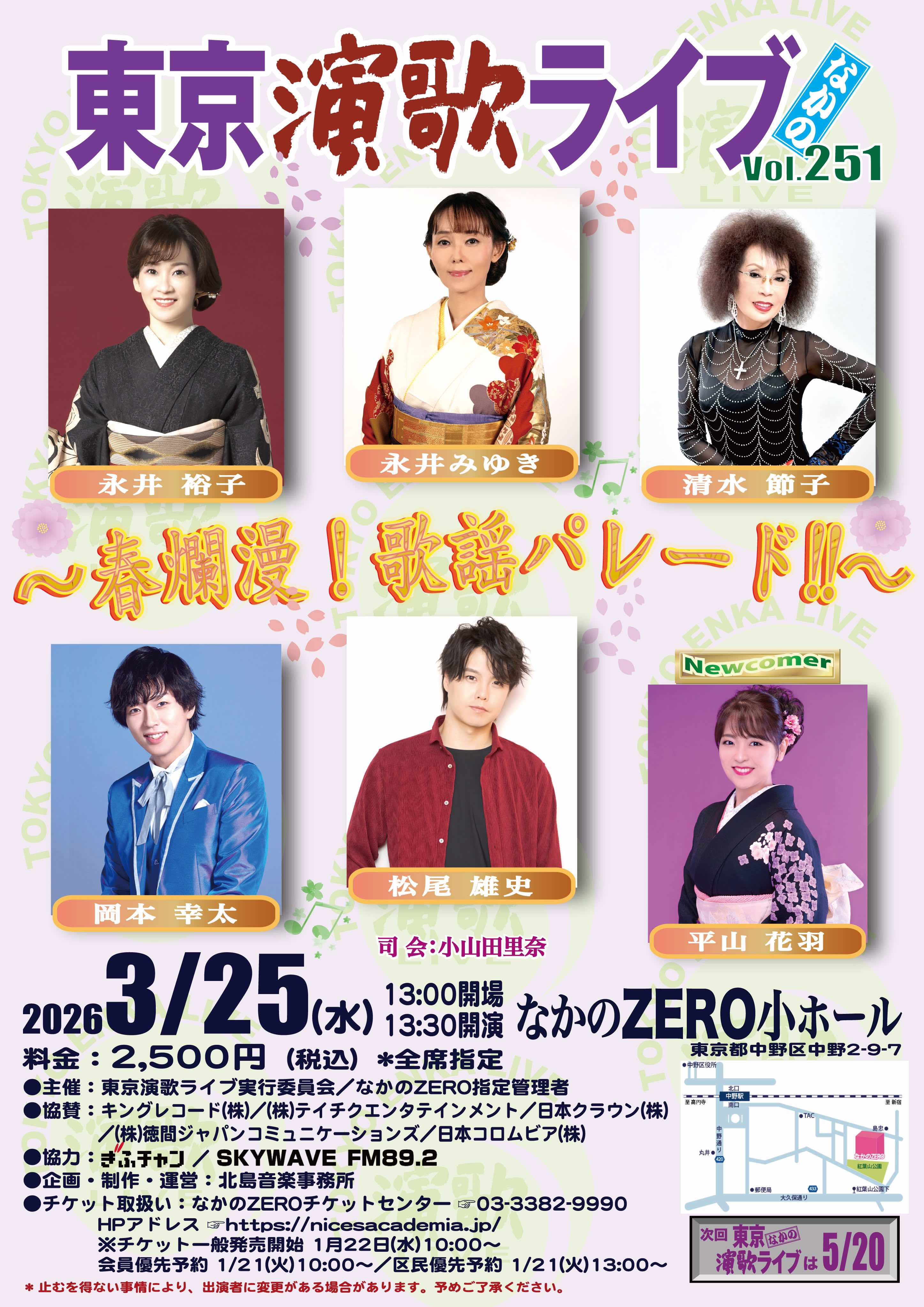 丘みどり 田川寿美 津吹みゆ 鳥羽一郎 平山花羽 松尾雄史 松原健之 山本譲二 由紀さおり ほか(五十音順)